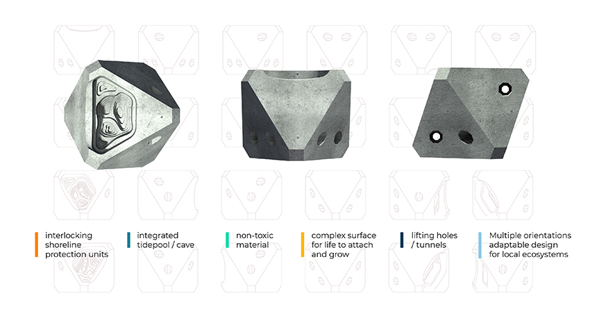 Interlocking armor is used along many of our coasts and waterfronts as a versatile solution for building breakwaters, coastal erosion control, and land reclamation. Many of the traditional armoring units are problematic in the impacts they have on the environment, damaging marine life alongside high carbon footprints. Traditional concrete comes with large costs, both economic and environmental because it lacks ecological consideration during construction.