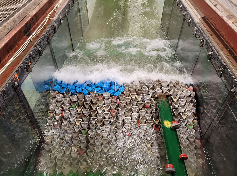 The Coastalock units were tested at NRC’s Large Wave-Current Flume facility in Ottawa, Canada, where two common types of model breakwaters were constructed at large scale (1/15). The low-crested and emergent rubble mound breakwater (RMBW) models were built as permeable structures using core material, underlayer rocks, toe armor, and Coastalock single layer armor units placed along the seaside, crest, and lee side of the breakwaters. More than 600 model scale replica Coastalock armor units were produced, each weighing around 1 kg.