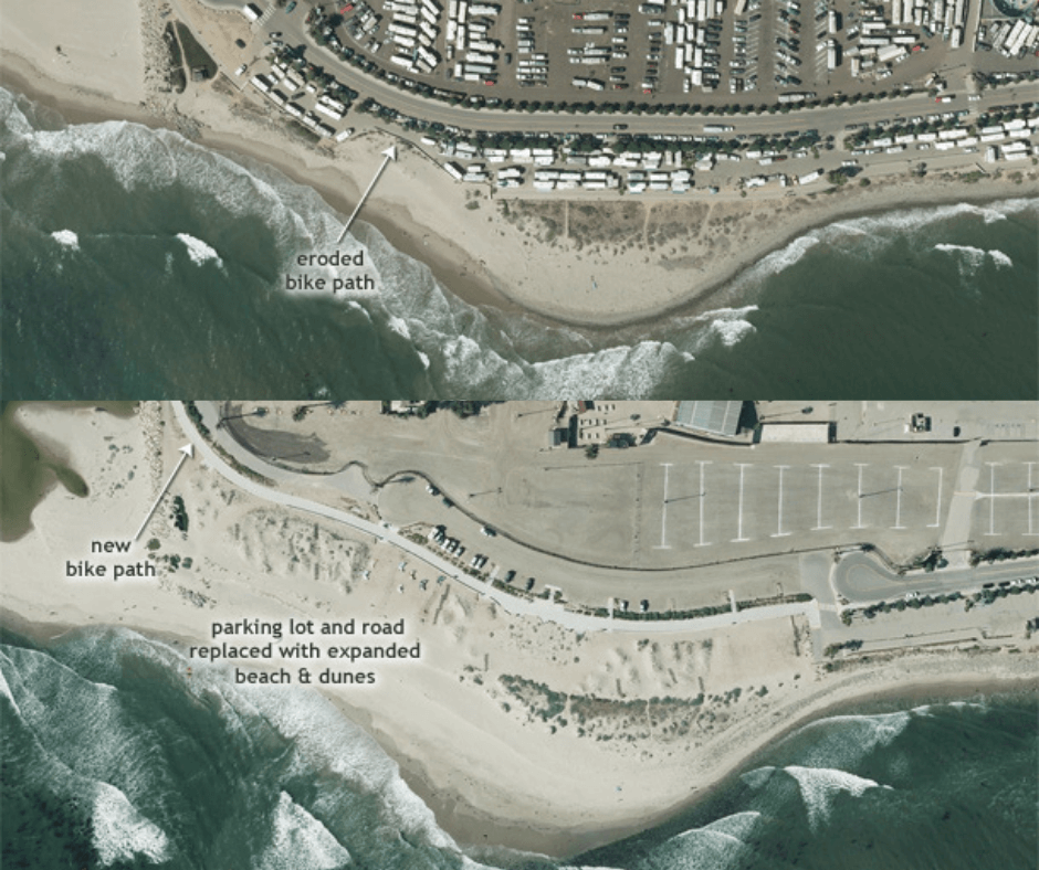 Why managed retreat?Surfer’s Point in Ventura, California was one of the world’s top surfing destinations, renowned for its waves. But over time, these waves eroded the shoreline, causing structural damage to public facilities like parking lots and bike paths. The city had attempted to “harden” the coast, a process of installing concrete or rock structures like breakwaters and seawalls, with little success. It became clear that there was one solution to Surfer Point’s deterioration: managed retreat, otherwise known as coastal realignment.Top: Before the retreat, 2010. Bottom: After the retreat, 2013. The Surfers’ Point Managed Retreat Shoreline Project included shifting parking areas and bike paths over 40 feet away from the coastline. Images taken from Climate.gov