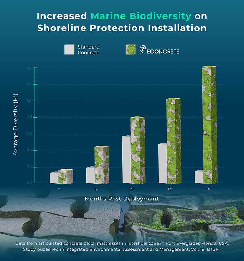 When it comes to habitat and ecological balance, nature takes care of things perfectly. As ECOncrete’s co-founder and CEO, Ido Sella explains, “the species are out there, the larvae are out there. The problem is that for a very long time they did not have a place to settle and thrive in an urbanized area.” ECOncrete makes that possible by mimicking the natural conditions in a particular area. On the micro level, ECOncrete admixtures chemically balance the concrete, reducing permeability and creating greater chloride ion resistance. ECOncrete creates substrate less adverse to marine organisms and facilitates attachment with different habitats allowing for a wide variety of species to settle (i.e., holes, caves, overhangs, tunnels). ECOncrete accomplishes this through complex textures and designs. These innovations allow for marine life not only to settle but to persist and thrive, which over time strengthens the structure itself.The resulting infrastructure meets ecological needs while maintaining structural integrity. Our technology can be integrated into any project to combat the adverse effects of coastal hardening, as shown in multiple peer-reviewed papers quantifying the ecological performance of structures using ECOncrete. With solutions like ours, the expansion and fortification of populated coastlines do not have to come at the expense of marine biodiversity.