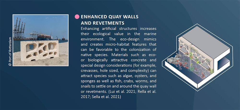 Among the various NBS families explored in the report, “enhanced hard structures” stand out for their unique ability to transform conventional concrete elements into ecologically valuable assets – from breakwaters and sediment stabilization to port quay walls.