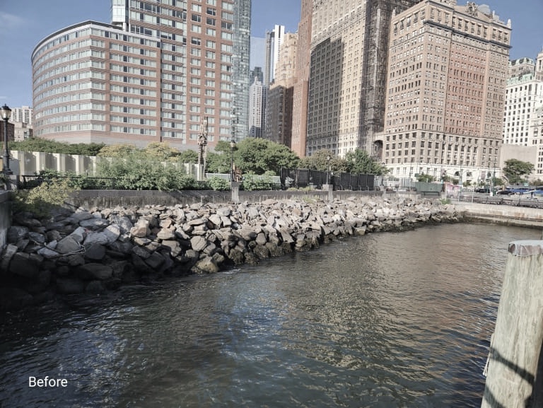 New York’s South Battery or Wagner Park features a prominent Manhattan waterfront. The Pier A inlet was designed with future-proof flood-protection. We provided the nature-based design and concrete elements for Pier A inlet to support biodiversity within a flood protection infrastructure. (Image: The park’s waterfront ‘before’ with rock riprap.)